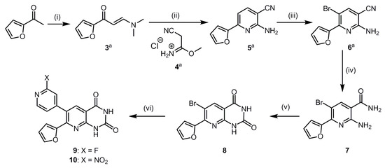 Synthesis of the new A2B receptor ligand 9 and its precursor for radiofluorination 10. Reaction conditions: (i) N,N-dimethylformamide dimethyl acetal, reflux, 5.5 h, 90%, (ii) 4, NH4OAc, MeOH, reflux, 12 h, 70%, (iii) N-bromosuccinimide (NBS), N,N-dimethylformamide (DMF), 12 hours, rt, 77%, (iv) 6 M NaOH, H2O2, 50 °C, 5 h, 45%; (v) a) NaH, DMF, 30 min, rt, b) N,N-carbonyldiimidazole, 90 °C, 2 h, 50%; (vi) 9: 2-fluoro pyridine-4-boronic acid, 2 M Cs2CO3, [Pd(dppf)Cl2], 1,4-dioxane, 90 °C, 2 h, 59%; 10: (a) 4-bromo-2-nitropyridine, 4,4,4’,4’5,5,5’,5’-octamethyl-2,2’-bis(1,3,2-dioxaborolane), KOAc and [Pd(dppf)Cl2], 90 °C, 1 h (b) 2 M Cs2CO3, [Pd(dppf)Cl2], 90 °C, 1 h, 9%. a The synthesis of compounds 3–6 has been previously reported [18,19,20] and was performed accordingly with slight modifications, as described in the Supplementary material.