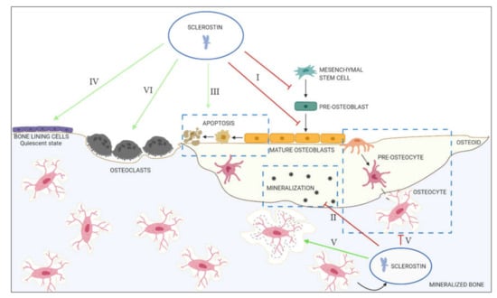 Overview of the actions of sclerostin in the bone. I: Inhibition of proliferation and differentiation of osteoprogenitor/pre-osteoblastic cells, as well as decreased activation of mature osteoblasts; II: decreased mineralization; III: increased apoptosis of the osteogenic cells; IV: maintenance of bone lining cells in their quiescent state; V: regulation of osteocyte maturation and osteocytic osteolysis; VI: stimulation of bone resorption.