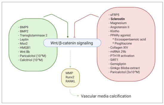 Vascular media calcification, also named arteriosclerosis, or Mönckebergs’ sclerosis, is characterized by concentric calcifications in the tunica media of large elastic arteries, medium-sized visceral and renal arteries, as well as in small transitional arteries [,,]. The principal consequences are increased wall thickness, arterial stiffening and development of left ventricular hypertrophy. This type of calcification, although frequently observed with aging in the general population, is strongly pronounced in patients with CKD, diabetes mellitus and other metabolic disorders. In CKD patients, elevated calcium and phosphate levels exert direct effects on VSMCs in order to stimulate vascular calcification. This is done by promoting osteochondrogenic transdifferentiation of VSMCs, VSMC apoptosis, matrix vesicle release, loss of calcification inhibitors and degradation of the extracellular matrix. Similar to intimal calcification, the canonical Wnt signaling pathway is also activated in vascular media calcification, as demonstrated by several studies [,,,,,,,,,]. Its activation is further regulated by numerous factors, as described in Figure 2. Most of the factors that activate the canonical Wnt signaling act by directly stimulating β-catenin expression and/or accumulation in the nucleus [,,,,]. Other mechanisms, such as upregulation of Wnt ligands [,] and decreased expression of Wnt inhibitors [], however, are also involved. Activation of the Wnt/β-catenin signaling, in turn, promotes vascular calcification by different mechanisms, amongst which are: (1) the modulation of Runx2 gene expression, which stimulates osteochondrogenic transdifferentiation of VSMCs []; (2) the induction of matrix metalloproteinases []; and (3) the upregulation of RANKL expression []. Given the important clinical consequences of vascular media calcification, many researchers have been investigating the inhibitors of the canonical Wnt signaling in the context of vascular media calcification. One of the mechanisms to inhibit activation of this signaling cascade is by preventing Wnt ligands to bind to their receptors. This can be achieved either by: (1) binding of secreted Frizzled-related proteins (sFRP) to Wnt ligands, which makes it impossible for Wnt ligands to bind to the Fz receptor [],; or possibly (2) also by binding of sclerostin to the LRP4/5/6 receptors, which makes these receptors unavailable for Wnt-ligands [,]. Other mechanisms that have been described to inhibit vascular calcification by inactivating the Wnt/β-catenin signaling include magnesium [] (and angiotensin II, which stimulates magnesium influx []), Klotho [], PPARγ agonists [,], Collagen XIV [], microRNAs [,,], PTH receptor activation [], Sirtuin1 [,], the anti-diabetic drug gemigliptin [] and Ginkgo Biloba extract []. Data regarding the role of calcitriol and its analog paricalcitol in the activation of Wnt/β-catenin signaling and the vascular calcification process are conflicting. It is likely that their effects on vascular calcification development are dose-dependent [,].
