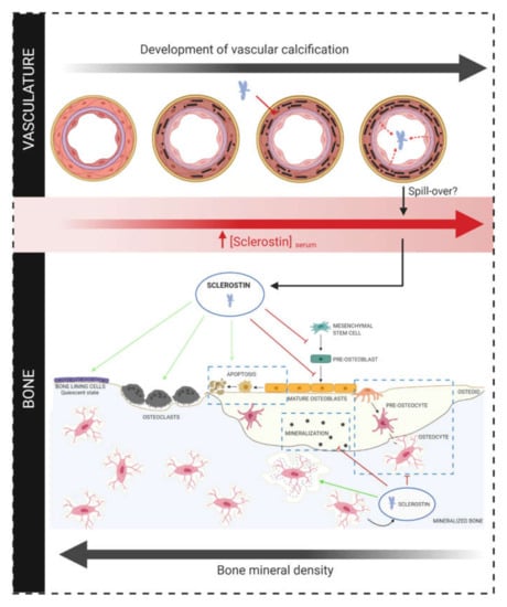 Conflicting results in the association between circulating sclerostin levels and severity of calcification/cardiovascular mortality could also be linked to sclerostin’s primary role, i.e., effects at the level of the bone. In addition to its potential effects on cardiovascular mortality, by altering the vascular calcification process, increased serum sclerostin levels can also have consequences at the level of the bone. In CKD patients, but also in osteoporosis patients, ectopic vascular calcification is frequently accompanied by a reduced bone mineral density and disturbed bone turnover. This seemingly contradictory association is called the calcification paradox []. During this pathological process, the regulation of several molecules and pathways involved in calcium and phosphate homeostasis (FGF23, PTH, Vit D, Klotho) is disturbed, leading to renal osteodystrophy/osteoporotic bone loss on the one hand, and ectopic calcification on the other hand. Also sclerostin might be involved in this process, since it is hypothesized that sclerostin produced in the vasculature can spill over into the circulation, via which it reaches the bone compartment, where it inhibits bone formation/mineralization/turnover [,] (Figure 3), thereby inhibiting the bone’s buffering capacity for calcium and phosphate, and making it available for deposition in the vessel wall.