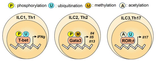 An overview of regulation for transcription factors T-bet, Gata3, RORγt by post-translational modifications (PTMs) in innate lymphoid cells (ILCs) and T helper cells. Transcription factors T-bet, Gata3 and RORγt are regulated by the post-translational modifications (P: phosphorylation; U: ubiquitination; M: methylation; A: acetylation) and the color differences indicate various modifications on their targets.