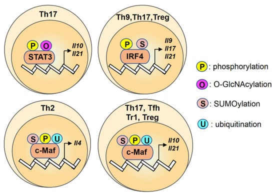 An overview of regulation for transcription factors STAT3, IRF4, c-Maf by post-translational modifications in T helper cells. Transcription factors STAT3, IRF4, c-Maf are regulated by the post-translational modifications (P: phosphorylation; O: O-GlcNAcylation; S: SUMOylation; U: ubiquitination) and the color differences indicate various modifications on their targets.