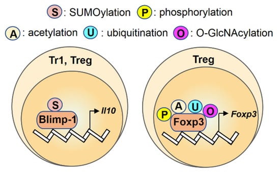 An overview of regulation for transcription factors Blimp-1 and Foxp3 by post-translational modifications in Tr1 and Treg cells. Transcription factors Blimp-1 and Foxp3 are regulated by the post-translational modifications (S: SUMOylation; P: phosphorylation; A: acetylation; U: ubiquitination; O: O-GlcNAcylation) and the color differences indicate various modifications on their targets.