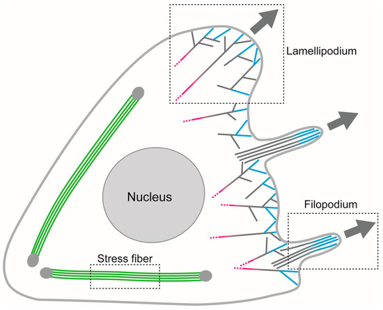 - Pollard, T.D.; Borisy, G.G. Cellular motility driven by assembly and disassembly of actin filaments. Cell 2003, 112, 453–465. [Google Scholar] [CrossRef]