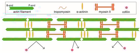 Stress fibers are contractile force-generating bundled structures mainly composed of actin filaments and myosin II filaments [79], and are found in nonmuscle cells such as fibroblasts, endothelial cells, myofibroblasts and epithelial cells. The coordination of stress fibers and cell adhesion controls cell migration and cell morphogenesis. Stress fibers contain proteins with various functions, such as actin crosslinking proteins and kinases, in addition to actin filaments and myosin II [80]. The formation and contraction of stress fibers are controlled by the coordinated function of these proteins. The cooperative interaction between actin filaments and ABPs presumably plays a role in the correct assembly of stress fibers. For example, if the actin-depolymerizing protein, cofilin, enters a stress fiber, actin filaments constituting the stress fiber will be severed and its structure will be disrupted.