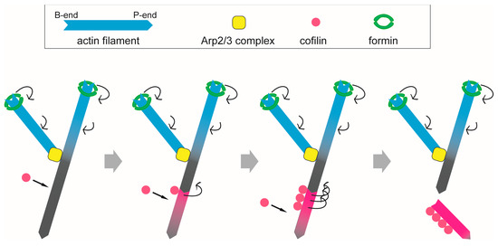 HS-AFM observation revealed that shortening of the helical pitch of actin filaments induced by cofilin binding propagate to the pointed-end side of the cofilin cluster, and that cofilin clusters grow unidirectionally toward the pointed-end of the filament [32]. Severing by cofilin was often observed near the boundaries between cofilin clusters and bare zones or within each cofilin cluster [32]. Cluster growth on the pointed-end side of the initially bound cofilin molecule may accumulate strain within the cluster, resulting in severing of actin filaments at the boundary between the cluster and the bare region and/or inside the cluster. In lamellipodia, the pointed end and barbed end of actin filaments are oriented toward the nucleus and leading edge of the cell, respectively. Formin is bound to the barbed end of actin filaments [78]. Helical rotation of formin decreases the helical twist of an actin filament if there is rotational friction between the formin molecule and the surroundings and between the actin filament and the surroundings. This would confer resistance to cofilin [95]. Cofilin interacts with actin filaments in sections near the pointed end and depolymerizes filaments because structural changes due to formin bound at the barbed end are probably not transmitted to the sections close to the pointed end due to the branch involving the ARP2/3 complex [78,96] (Figure 3). This structural effect, together with the differential distribution of ATP-, ADP•Pi- and ADP-bound protomers along the filament [97,98], which is not discussed in this article, may allow cofilin to efficiently depolymerize actin filaments deeper inside a cell, which are no longer necessary for the generation of force along the leading edge of a lamellipodium.