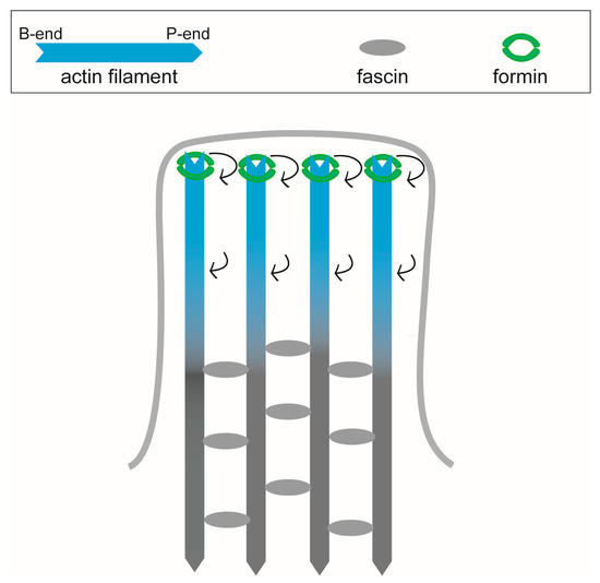 Filopodia are thin (diameter 0.1-0.3 µm), finger-like projections containing parallel bundles of actin filaments, and function as an antenna for detecting the cell environment [78,99]. The major actin filament-bundling protein in filopodia is fascin [100]. The homologous molecules of fascin have been discovered in a wide range of species, from insects to mammals [101]. The distribution of fascin throughout the actin filament bundles in filopodia [102,103] suggests that fascin can bind to actin filaments independently of formin binding and stabilize filopodia (Figure 4). The crosslinking of actin filaments by fascin presumably suppresses the propagation of structural changes of filaments, including not only untwisting by formin but also supertwisting by cofilin. In fact, Hirakawa et al. reported that cofilin was difficult to cooperatively bind to actin filaments tightly immobilized on a glass surface using biotin-avidin linkages [23]. It is likely that filopodia show resistance to cofilin due to the untwisting of filaments by formin and the crosslinking of filaments by fascin (Figure 4).