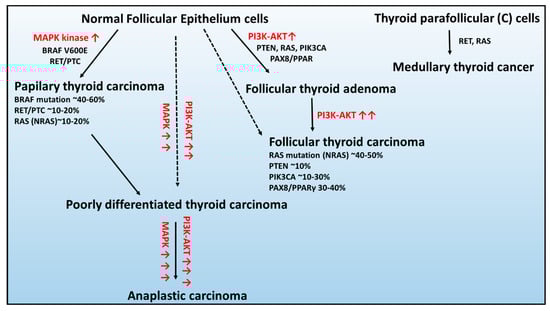 - Hou, P.; Liu, D.X.; Shan, Y.; Hu, S.Y.; Studeman, K.; Condouris, S.; Wang, Y.G.; Trink, A.; El-Naggar, A.K.; Tallini, G.; et al. Genetic alterations and their relationship in the phosphatidylinositol 3-kinase/Akt pathway in thyroid cancer. Clin. Cancer Res. 2007, 13, 1161–1170. [Google Scholar] [CrossRef]