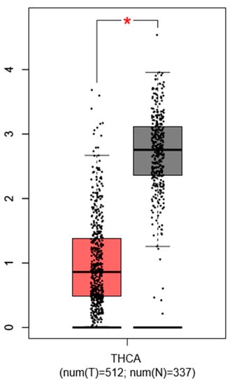 | MMP1 (Matrix metallopeptidase 1) | 4.025 | 4.30 × 10−22 | An enzyme responsible for the extracellular matrix remodeling [85] and can play a significant role in the invasion and recurrence of thyroid cancer (THC). Contrary to healthy thyroid cells, MMP-1 is secreted by thyroid cancer cells in vitro, and immunofluorescence staining showed the expression of MMP-1 protein in adenomas, papillary thyroid cancer (PTC) and follicular thyroid cancer (FTC) specimens [86,87]. Interestingly, an examination of the MMP1 mRNA in PTC cases revealed that the transcript was expressed in the fibrous capsules of PTC, but not in the PTC cells [88]. |