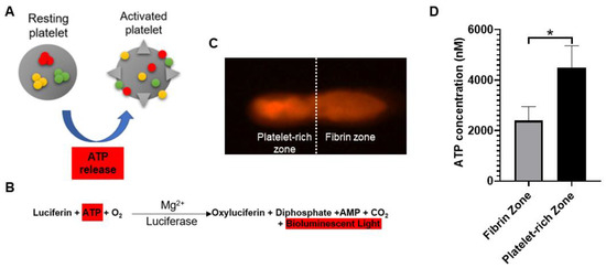 (A) Adenosine triphosphate (ATP) is released from dense granules during platelet activation. (B) Detection of activated platelets on platelet-rich fibrin (PRF) through bioluminescent assay. (C) PRF sample was observed under a fluorescence optical microscope. Based on bioluminescent intensity, the PRF could be equally divided into fibrin zone and platelet-rich zone. (D) The image brightness of bioluminescence was substituted into the ATP standard curve to determine the concentration of platelet-released ATP. The bars show the mean ± SD (n = 5) of each group. * p < 0.05.