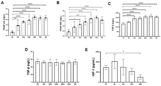 Time-sequential release profile of platelet-derived growth factor-AA (PDGF-AA), platelet-derived growth factor-BB (PDGF-BB), fibroblast growth factor-2 (FGF-2), transforming growth factor-β (TGF-β), and insulin-like growth factor-1 (IGF-1) from first hour to six days. The PDGF-AA, PDGF-BB, FGF-2, and TGF-β1 releases were sustained over six days. (A–C) The PDGF-AA, PDGF-BB, and FGF-2 releases were rapidly induced, and a maximum concentration was detected at 48 h and 72 h. (D) The TGF-β1 release was constant and sustained over six-day period. (E) The IGF-1 release decreased over time and could not be detected after 48 h. The bars show the mean ± SD fold change (n = 6) of each group. * p < 0.05; ** p< 0.01; *** p < 0.001; **** p < 0.0001.