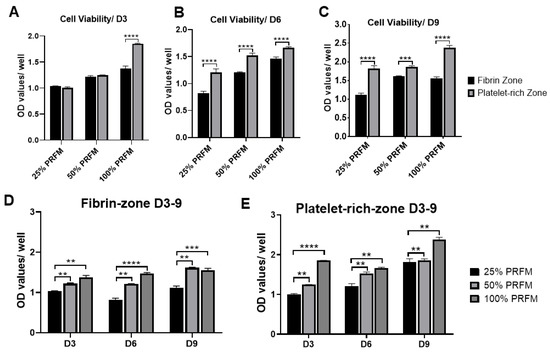 Differential effects of fibrin zone- and platelet-rich zone-platelet-rich fibrin conditioned medium (PRFM) on viability of tenocytes. (A–C) The MTT (3-(4,5-dimethylthiazol-2-yl)-2,5-diphenyltetrazolium bromide) assay was used to assess the viability of tenocytes under fibrin zone- and platelet-rich zone PRFM treatments at three different time points. On day 6 and day 9, platelet-rich zone PRFM was more potent than fibrin zone PRFM in promoting cell growth, regardless of PRFM concentration. (D,E) Dose-dependent effects of fibrin zone- and platelet-rich zone PRFM on viability of tenocytes during a nine-day culture. The bars show the mean ± SD fold change (n = 4) of each group. D3, day3, D6, day 6, D9, day 9. * p < 0.05; ** p < 0.01; *** p < 0.001; *** p < 0.0001.