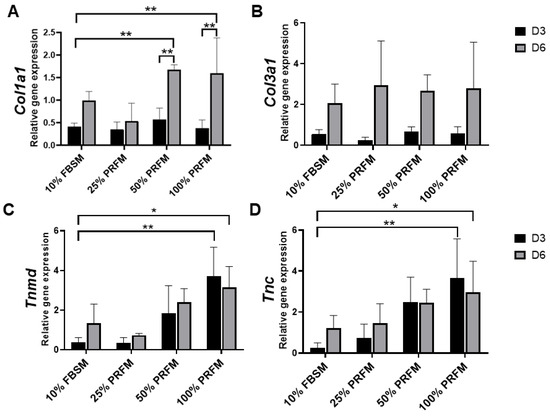 Quantitative expression profiles of (A) Collagen I (Col1a1), (B) Collagen III (Col3a1), (C) Tenomodulin (Tnmd), and (D) Tenascin (Tnc) of cultured tenocytes on day 3 and day 6. The asterisks indicate significant differences in the gene expression among all four groups: Dulbecco’s Modified Eagle’s Medium F-12 containing 10% fetal bovine serum (10% FBSM), and 25%, 50%, and 100% platelet-rich fibrin medium (PRFM) prepared from platelet-rich zone PRF. The bars show the mean ± SD fold change (n = 4) of each group. D3, day3, D6, day 6. * p< 0.05; ** p< 0.01.