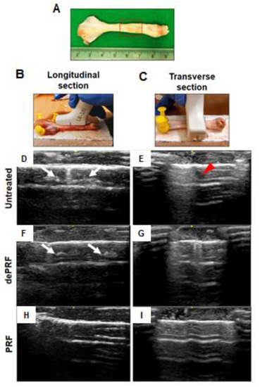 Sonographic evaluation of the healing process of rabbit Achilles tendon after platelet-rich fibrin (PRF) implantation. (A) Gross view of tendon specimens. The red rectangular frame highlighted the repaired zone. (B,C) The tendon specimens were evaluated longitudinally (B) and transversely (C). Tendon sonographic images in the untreated control (D,E), the heat-denatured PRF group (dePRF) (F,G), and the PRF group six weeks after treatment (H,I). The white arrows indicate intratendinous hyperechoic areas suggesting scar tissue formation. The red arrowhead indicates intratendinous fluid accumulation.
