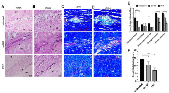 Figure 6A–D shows the histological images of the repaired tissues at three groups stained by hematoxylin and eosin (H&E) and Masson Trichrome (MT) at different magnification powers. In the untreated group, a cluster of round-shaped chondrocyte-like cells was found at the repaired zone. Moreover, the fibers were loosely composed without significant order (upper panel, Figure 6A–D). In dePRF group, the repaired zone was filled with heterogeneous tissues formed by fragmented collagen bundles. The tissues consist of cells in different shapes and sizes (middle panel, Figure 6A–D). The cartilage-like tissues and granulation tissues respective to untreated group and dePRF group were scarcely stained by MT. In the PRF group, most of the cells at the repaired zone were elongated in shape, resembling normal tenocytes. The cellularity is remarkably higher, and the collagen fibers were wavy and formed a crimping pattern (lower panel, Figure 6A–D). Moreover, the extracellular matrix composition at the repaired zone in the PRF group was strongly stained by MT, indicating dense collagen formation.