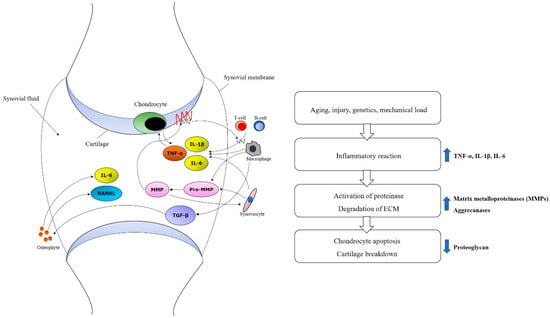 Molecular and cellular mechanism in development and progression of OA have to be aware for establishing therapeutic plan with MSC []. Innate immune cells like natural killer cell or macrophages can play an important role in an early inflammatory phase []. TNF-α and IL-1β also have a function to shift tissue homeostasis towards catabolism by degradation, resulting in cartilage resorption [,]. In addition, mechanisms such as increased proinflammatory cytokines such as IL-1 or TNF-α, decreased growth factors such as TGF-β, activated matrix metalloproteinase, and ultimate chondrocyte senescence can be observed at the molecular level (Figure 1) [,,].