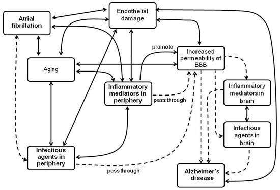 Given the above, is possible to suggest that infection by H. pylori may affect individuals with AF, especially in chronic states of arrhythmia, leading to an even stronger inflammatory response. Thus, it can increase the permeability of the BBB, favoring the passage of inflammatory molecules to the brain or even the infectious agent, which may be correlated directly with AD pathology. Further investigation is necessary to support this mechanism.