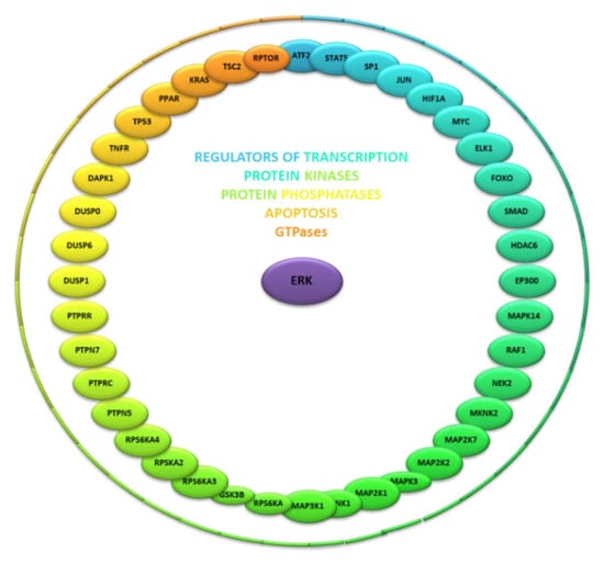 ERK1/2 kinase shares large number of protein interactors. BioGRID database contains 270 unique interactors of ERK2 kinase []. However, the association of several interactors with ERK2 kinase came from results obtained using high-throughput (HT) techniques or hit only in single evidence. Filtration of interactors based on less than three evidences and interactors tagged as HT mined about 50 protein interactors representing established targets of the ERK kinase (Figure 1). These interactors involve regulators of transcription (ATF2, STAT5, SP1, JUN, HIF1A, MYC, ELK1, FOXO3, SMAD1, HDAC and EP300), protein kinases (MAPK14, RAF1, NEK2, MKNK2, MAP2K7, MAP2K2, MAPK3, MAP2K1, MKNK1, MAP3K1, RPS6KA1, GSK3B, RPS6KA3, RPS6KA2 and RPS6KA4), protein phosphatases (PTPN5, PTPRC, PTPN7, PTPRR, DUSP1, DUSP6 and DUSP9), regulators of apoptosis (DAPK1, TNFRS1A, TP53 and PPARG) and GTPase activity-linked proteins (KRAS, TSC2 and RPTOR). Regulation of these protein interactors by ERK kinase provides diverse outputs on cellular functions.