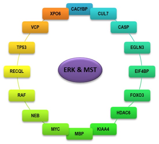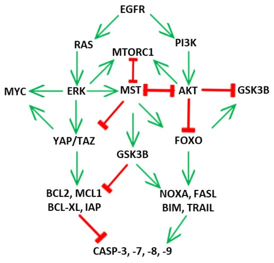 The Hippo signaling pathway controls development and organ size in diverse species. Deregulation of this pathway induces tumor formations in model organisms and occurs in a broad spectrum of human carcinomas []. MST1/2 serine/threonine kinases represent central regulators of the Hippo signaling pathway. Activation of MST1/2 kinase inhibits cellular proliferation and induces apoptosis in several cancer cells as well as in model organisms and hence acts as a tumor-suppressor []. Hippo/MST and MAPK/ERK signaling pathways share several mechanisms to regulate cellular proliferation and apoptosis. MST signaling decreases TEAD activity and expression of MYC oncogene in T-ALL cells and breast cancer cells as well as in xenograft mice model of breast cancer [,]. MST kinase regulates glucose metabolism in T-ALL, laryngeal squamous and breast cancer cells through inhibition of the TEAD transcription activity and expression of GLUT (glucose transporter) [,,]. MST kinase induces apoptosis through expression of pro-apoptotic protein NOXA in several cancer cells through phosphorylation and activation of FOXO (forkhead box O) transcription factors [,,]. MST kinase directly phosphorylates and activates pro-apoptotic protein BIM, caspase-3, -9 and apoptosis in pancreatic beta-cells []. Hippo/MST signaling also inhibits expression and activity of several anti-apoptotic proteins such as IAP, MCL1 and BCL-XL [,,]. MST also activates caspases and caspases potentiate MST kinase activity in positive feedback loops. MST signaling was described as a potent activator of caspase-3, -7,-9 and an intrinsic apoptotic pathway through mechanisms discussed above and cleavage of the MST kinase by caspase-3, -7 potentiates its pro-apoptotic activity [,,]. Moreover, activation of caspase-8 by the Hippo/MST signaling was also documented [,]. Interplay between caspase-8 and ERK signaling represents one of the key mechanisms in the EGFR signaling pathway as demonstrated by several reports rendering MST as a regulator of this process [,,]. Finally, a computational model predicting diverse dynamic profiles of the Hippo-ERK interaction network was constructed [].