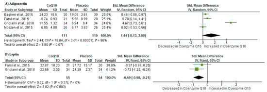 It is now well-established that adipose tissue functions as a vital organ for the secretion of adipose-derived factors or rather adipokines which play a key role in the regulation of inflammation []. In fact, one of these adipokines is adiponectin, an anti-inflammatory metabolite that has been shown to improve insulin sensitivity [,]. Interestingly, pooled estimates showed that CoQ10 supplementation in individuals with metabolic syndrome increased adiponectin levels when compared to those on placebo (SMD: 1.44 [95% CI: −0.13, 3.00]; I2 = 96%, p < 0.00001) (Figure 2A). On the other hand, leptin has been long identified as a pro-inflammatory metabolite that exacerbates inflammation in conditions of metabolic syndrome []. Remarkably, a meta-analysis of included studies revealed significant reduction of leptin levels in individuals on CoQ10 supplementation when compared to those on placebo (SMD: −0.59 [95% CI: −0.98, −0.21]; I2 = 0%, p = 0.37) (Figure 2B).