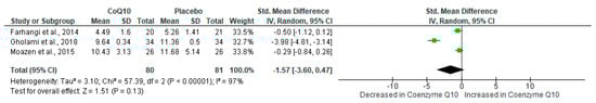 It is well-recognized that individuals with metabolic syndrome have increased levels of oxidative stress, especially lipid peroxidation []. The latter is also a relevant target of CoQ10 in light of its critical role as a lipophilic antioxidant []. Interestingly, CoQ10 supplementation reduced MDA levels, as a marker of lipid peroxidation, when compared to placebo (SMD: −1.57 [95% CI: −3.60, 0.47]; I2 = 97%, p < 0.00001) (Figure 4).