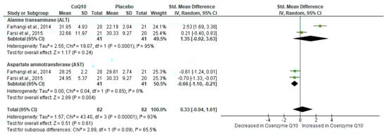 Briefly, NAFLD remains one of the major characteristic features of metabolic syndrome [], and this condition is persistent with the rise in hepatic enzymes such as alanine transaminase and aspartate transaminase (AST). Here, pooled estimates showed a small effect size in the liver function among individuals on CoQ10 supplements versus those on placebo (SMD: 0.33 [95% CI: −0.94, 1.61]; I2 = 93%, p < 0.00001) (Figure 6). Despite substantial levels of heterogeneity, the test for subgroup differences showed no significant subgroup effect (p = 0.09). The overall summary of findings on the beneficial effects of CoQ10 supplementation in individuals with metabolic syndrome is provided in Table 2.