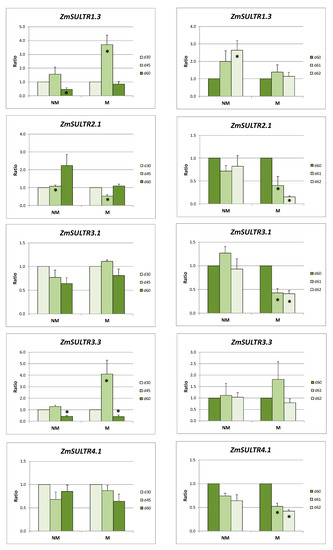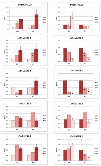 Sulfate supply resulted in downregulation of ZmSULTR2.1 in roots and leaves of NM and M plants. On the other hand, the expression ratio of ZmSULTR1.3 remained stable in the leaves of M plants and increased in NM plants. This response of ZmSULTR1.3 indicates the efficient transport and phloem unloading to leaves, according to differentiated needs of NM and M plants.