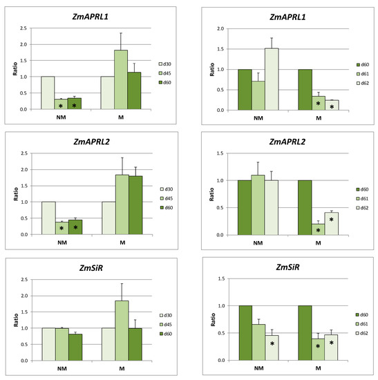The ZmAPRL1 and ZmAPRL2 expression levels in the leaves of NM plants were strongly decreased both at days 45 and 60. On the contrary, the expression levels of these genes remained stable in the leaves of M plants at the same days. The exact opposite results were observed in the leaves of NM and M plants after the sulfate supply: the expression ratios of the two ZmAPRL genes remained unaffected in NM plants, whereas they were strongly downregulated in M plants. The expression of ZmSiR presented an identical response between NM and M plants: stable during the long sulfur-deficient period of time and reduced after the provision of sulfate (Figure 4).