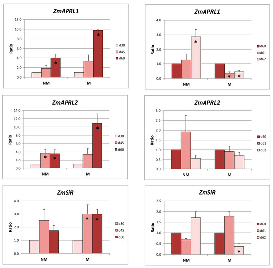 Relative expression ratios (the mean of six biological replicates ± SE) of ZmAPRIL1, ZmAPRL2, and ZmSiR in the leaves of non-mycorrhizal (NM) and mycorrhizal (M) maize plants before (left column) and after (right column) the supply of sulfate. d30/d45/d60/d61/d62: days after sowing. Significant differences (p < 0.05) between the samples and the respective controls are represented by an asterisk (*).