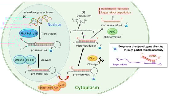 One of the possible mechanisms and pathways of the miRNA biogenesis within eukaryotic cells of mammals. We have marked with a blue pill drawing and a number 1* to 4* the possible miRNA and miRNA precursors that can be targeted for the different therapeutic strategies explained in Section 4. (#) Indicates that this pathway can be different.