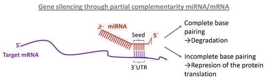 These segments match a complementary sequence of the 3’ untranslated region (UTR) of the mRNA, 5’ UTR or within the mRNA coding sequence. The union of the miRNA to the mRNA promotes this oligonucleotide destruction, downregulating the expression of their codified protein. This inhibits the protein synthesis []. However, the regulation of the gene expression can be accomplished through different genetic and epigenetic mechanisms. The method of choice varies depending on complementarity. If the miRNA matches perfectly to the target mRNA the interference pathway is activated and the mRNA degraded. But, in the case that the base pairing is incomplete, miRNA hybridize partially to the cognate region of the mRNA, forcing the repression of the protein translation []. In addition to these functions, miRNA has been found to be involved in chromatin modification and in the methylation pathway [,]. There is a general consensus on the lack of full knowledge about all mechanisms for gene silencing and biological functions of miRNAs and there is a constant release of new information about novel roles of these molecules in human disease [].