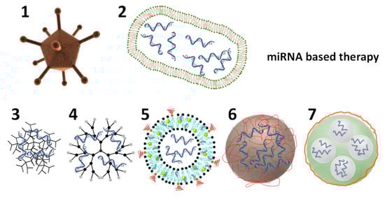 Schematic representation of different nanovectors loaded with miRNA-based therapies. (1 & 2) depict an adenovirus and an EDVTM nanocell. (3) Depicts a nanovector made of a positively charge polymer and negatively charged miRNA-based therapy. (4) Depicts a dendrimer. (5) Depicts a multifunctional liposome, loaded in its interior with miRNAs and functionalized with PEG (in red) on its surface and a contrast agent (yellow star) within the lipidic bilayer. (6) Depicts a solid nanoparticle coated with a positively charged polymer (in red) and the miRNA-based therapy via self-assembly. (7) Depicts a porous solid particle which encapsulates the miRNA-based therapy within its pores and it is coated to seal the pores. Therapeutic miRNA is depicted in blue and polymeric coatings in red.