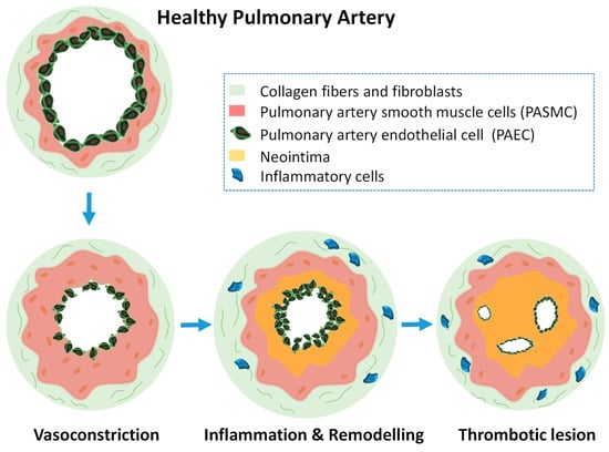 Schematic drawing of a transversal section of a pulmonary artery developing PH and the structural alterations in the different cellular levels. Initially smooth muscle cells excessively proliferate producing vasoconstriction. After that, inflammation, remodeling, and thrombotic lesions will follow.