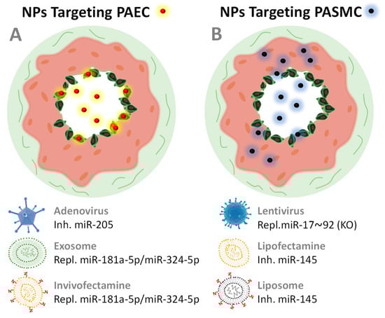 Schematic drawing of a cross section of two pulmonary arteries that develop PH and are being treated with nanopharmaceuticals (represented as small red and black spheres) that target the endothelial cells of the PAEC arteries (A) or smooth muscle cells PASMC (B). Endothelial dysfunction leads to a patent state in which NPs can leak into the pulmonary vasculature and reach PASMC more easily than in healthy arteries. The nanovectors collected in Table 3 are shown here.
