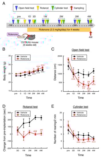 Behavioral assessment including open field, rotarod, and cylinder test was performed at 1–6 days before (pre), 1, and 3 days, and 1, 2, 3, and 4 weeks after implantation of vehicle- or rotenone-filled pump. Behavioral test was conducted from 12:00 to 16:00. Mice were habituated to the testing room at least for 1.5 h prior to behavioral assessment. Experimental areas were cleaned with 70% ethanol and wiped dry before setting the next animal. All data were analyzed using video tracking system (LimeLight, Neuroscience, Inc., Tokyo, Japan).
