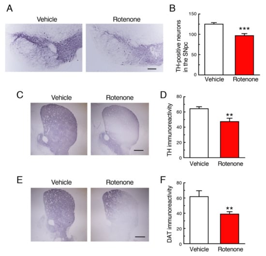 Chronic subcutaneous treatment with a low dose of rotenone (2.5 mg/kg/day) for 4 weeks significantly decreased the number of tyrosine hydroxylase (TH)-positive dopaminergic neurons in the SNpc (Figure 2A,B) and signal intensity of TH in the striatum (Figure 2C,D). In addition, nerve terminal degeneration of dopaminergic neurons in rotenone-treated mice was examined by immunostaining for dopamine transporter (DAT) using striatal sections. The striatal DAT-positive signal was also significantly decreased by rotenone treatment (Figure 1E,F).