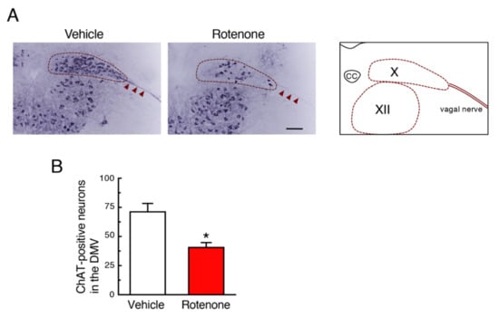 Chronic exposure to low-dose rotenone induced cholinergic neurodegeneration in the dorsal motor nucleus of the vagus (DMV) of mice. (A) Representative photomicrographs of immunohistochemistry for choline acetyltransferase (ChAT) in the DMV of mice 4 weeks after rotenone treatment. Scale bar = 100 µm. CC: central canal, X: DMV, XII: hypoglossal nucleus. Arrowheads: Vagal nerve. (B) Changes in the number of ChAT-positive neurons in the DMV. Each value is the mean ± SEM (n = 4). * p < 0.05 vs. the vehicle-treated control group (two-tailed unpaired independent t-test).