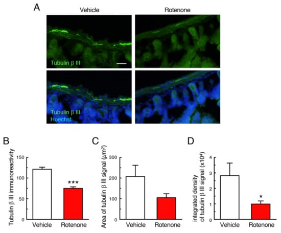 To examine effects of rotenone exposure on the intestinal myenteric plexus in mice, we performed immunostaining of the neuronal marker, Tubulin β III. In vehicle-treated group, apparent Tubulin β III-positive signals were detected in the intestinal myenteric plexus (Figure 4A). In contrast, rotenone treatment significantly decreased the Tubulin β III immunoreactivity in the intestinal myenteric plexus (Figure 4A–D).