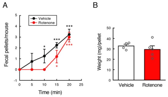 Chronic exposure to low-dose rotenone induced GI dysfunction in mice. Fecal output was measured at 4 weeks after implantation of vehicle- or rotenone-filled pump. (A) Time course of fecal outputs over 20 min. Each value is the mean ± SEM (Vehicle: n = 4; Rotenone: n = 5). (B) Weight (mg) of feces per pellet. Values are presented as dot blots with individual value plus bar with mean ± SEM (Vehicle: n = 4; Rotenone: n = 5). * p < 0.05, *** p < 0.001 vs. value at 0 min (one-way ANOVA followed by Fisher’s LSD test).