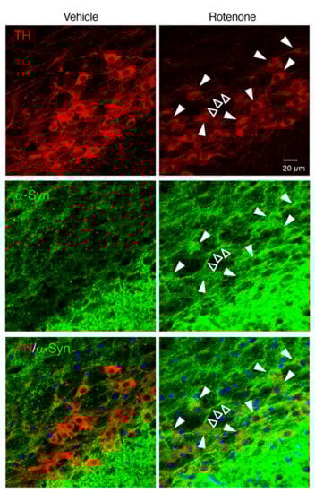 To examine whether chronic rotenone exposure induced α-Syn accumulation in the nigral dopaminergic neurons, we performed double immunostaining of TH and α-Syn. Rotenone treatment increased the α-Syn signals in the soma and neurites of TH-positive neurons in the SNpc (Figure 6).