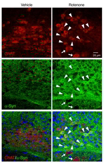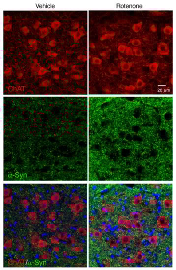 To examine whether chronic rotenone exposure induced α-Syn accumulation in the cholinergic neurons in the DMV, we performed double immunostaining of ChAT and α-Syn. Apparent α-Syn-positive signals were detected in the ChAT-positive neurons in the DMV of rotenone-treated mice (Figure 7).