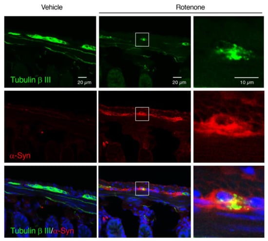 To examine whether chronic rotenone exposure induced α-Syn accumulation in the myenteric plexus in the small intestine of mice, we performed double immunostaining of Tubulin β III and α-Syn. Rotenone exposure dramatically increased α-Syn-positive signals in the myenteric plexus. We also confirmed α-Syn accumulation in soma of Tubulin β III-positive neurons in rotenone-treated mice (Figure 9).