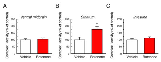 Rotenone is a mitochondrial complex I inhibitor. To examine effects of long-term exposure to rotenone on mitochondrial function, we measured complex I activity using tissue samples of ventral midbrain, striatum and intestine. Chronic rotenone exposure did not decrease mitochondrial complex I activity in both CNS and ENS. In the striatum, rotenone treatment rather increased complex I activity (Figure 10).