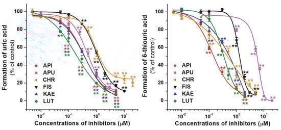 First, the effects of flavonoid aglycones (API, CHR, FIS, KAE, and LUT) on the XO-catalyzed xanthine and 6MP oxidation were examined. Each flavonoid tested was able to inhibit both uric acid and 6-thiouric acid formation at nanomolar or low micromolar concentrations (Figure 3). Regarding xanthine oxidation, LUT was the strongest while CHR was the weakest inhibitor (Table 1); and each aglycone showed similar inhibitory potency to allopurinol. However, API and FIS were the strongest and weakest inhibitors of 6MP oxidation, respectively (Figure 3, right). In addition, each flavonoid aglycone was considerably stronger inhibitor of XO-catalyzed 6-thiouric acid formation compared to allopurinol (Table 1).
