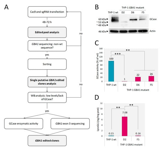 On the contrary, gene disruption mediated by CRISPR/Cas9 technology is permanent and complete, and thus, repetitive administration is not required []. In addition, the application of editing technologies to commercial cell lines offers the opportunity to easily generate isogenic cells, avoiding confounding results due to different genetic backgrounds. For these reasons, we edited GBA1 in two cell types that are relevant for disease pathology: U87 (as a model of glial cells) and THP-1 (as a model of monocytes). Differently from GCase-null HEK and A549 cells developed by Drews et al. [], both THP-1 and U87 GBA1 mutant clones do express mutant but non-functional forms of GCase.
