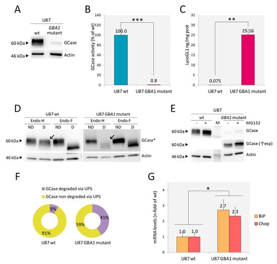 Development and characterization of U87 GBA1 mutant cells. WB analysis of U87 GBA1 mutant cells showed lower levels of GCase expression in comparison to U87 wt (A). A significant reduction of GCase enzymatic activity (B), as well as LysoGL1 accumulation (C), were detected. When digested by Endo-H, U87 GBA1 mutant showed lack of mature GCase (indicated by arrows in D); the Endo-F cleavage pattern confirmed that difference in protein migration on SDS-PAGE was only due to protein glycosylation [*GCase detection was performed at differential exposure time between U87 wt and U87 GBA1 mutant] (D). A significant increase of GCase protein abundance was detected in cells treated with the proteasome inhibitor MG132 by WB (E). The quantification of GCase signals, normalized to actin, in the presence and absence of MG132 showed that 32% of the mutant protein was subjected to proteasomal degradation (F). mRNA levels of ER stress markers BiP and Chop were significantly increased in U87 GBA1 mutant cells in comparison to U87 wt (G). Results are expressed as mean ± SD of three independent experiments. * p < 0.05, ** p < 0.001, *** p < 0.0001. Abbreviations: M = marker, ND = non digested, D = digested, (↑exp) = longer exposure.