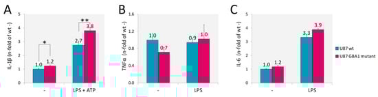 Since inflammation is a key player in the pathogenesis of GD, we assessed U87 GBA1 mutant cells for inflammatory cytokines whose increase has been observed in patients serum and in several GD models [,,,,]. In addition, inflammation and neuroinflammation have been recently demonstrated also in a fly model of GD []. We found increased production of interleukin-1β (IL-1β) (Figure 3A), but no production of tumor necrosis factor α (TNFα) nor interleukin-6 (IL-6) (Figure 3B,C) by U87 GBA1 mutant cells. IL-1β secretion by this GD model implies a constitutive activation of inflammasome. Indeed, when we activated inflammasome by adding LPS and ATP, a higher increase of IL-1β production was detected.
