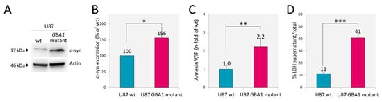 Recent data suggest that astrocytes may contribute, at least in part, to the mechanism linking GD and PD []. Therefore, we analyzed α-syn expression. U87 cells even under normal conditions express detectable levels of monomeric α-syn and the presence of mutant inactive GCase resulted in a significant increase of α-syn abundance, as reported in Figure 4A,B. A recent report revealed that the presence of mutant GCase both in SHSY5Y cells and in Drosophila dopaminergic cells leads to accumulation and aggregation of α-syn and to faster death of these cells []. Given the finding of increased levels of α-syn in our U87 model, we aimed to analyze if it was accompanied by increased cell death. In the culture of U87 GBA1 mutant cells, we found an increased percentage of apoptotic cells, as assessed by Annexin V/IP in comparison to U87 wt (Figure 4C). Moreover, cell death was more prominent in the mutant cells as shown by the release into the cell culture medium of the cytosolic enzyme lactate dehydrogenase (LDH) associated with damage of the plasma membrane (Figure 4D).