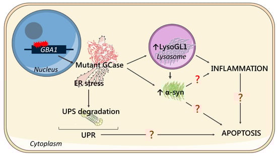 Schematic representation of the main cellular features and their possible correlation. Mutations in the GBA1 gene cause the synthesis of a mutant form of GCase, which is retained in the ER causing ER stress and subjected to degradation via the ubiquitin-proteasome system (UPS degradation), triggering unfolded protein response (UPR). The low enzymatic activity of the mutant GCase leads to LysoGL1 accumulation in lysosomes, which has been associated with neuroinflammation. Mutated GCase and substrate storage might lead to α-syn accumulation, which may have a direct role in the development of inflammation. Moreover, α-syn accumulation, UPR and/or inflammation may be the key triggers of apoptotic processes, eventually causing cell death.
