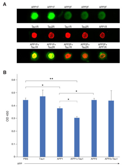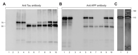 - Smith, M.A.; Siedlak, S.L.; Richey, P.L.; Mulvihill, P.; Ghiso, J.; Frangione, B.; Tagliavini, F.; Giaccone, G.; Bugiani, O.; Praprotnik, D.; et al. Tau protein directly interacts with the amyloid β-protein precursor: Implications for Alzheimer’s disease. Nat. Med. 1995, 1, 365–369. [Google Scholar] [CrossRef]